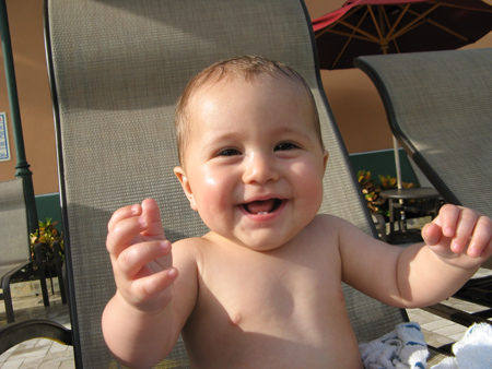 Day Two found us hanging out at the pool. Here is Cael with Mommy trying to ease into the water. |