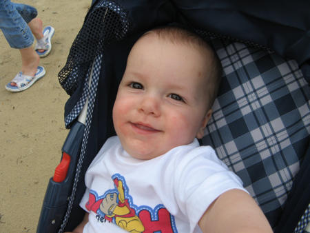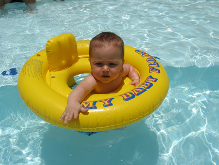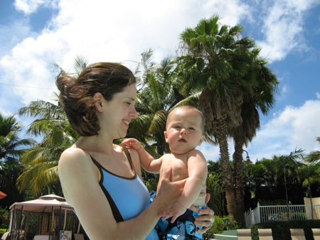 Day Two found us hanging out at the pool. Here is Cael with Mommy trying to ease into the water. |