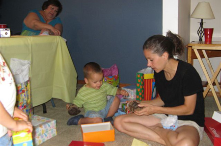 The opening of present had to be halted so Coy could try on his new kicks. |