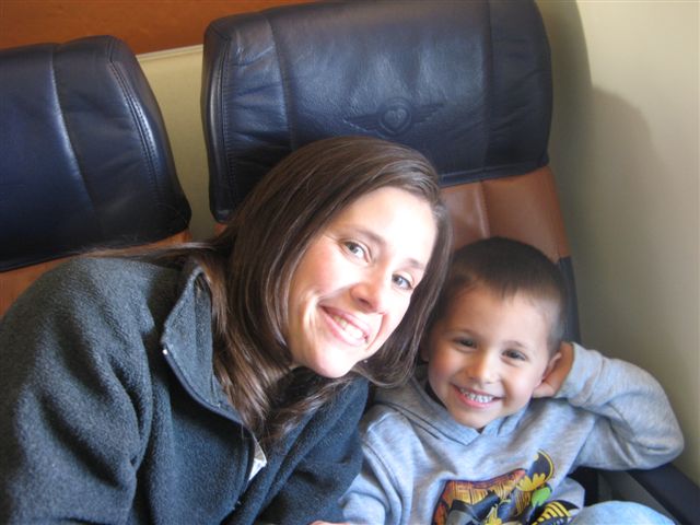 Here is Mommy and Cael stretching out on the plane before it takes off.
